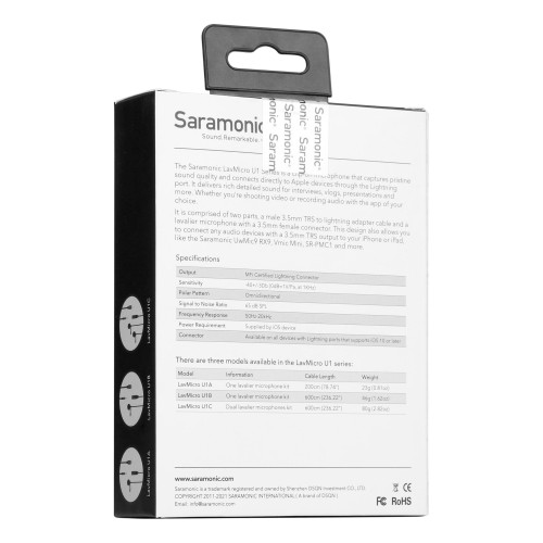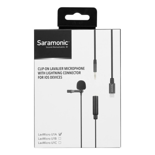 میکروفون یقه ای Saramonic LavMicro U1A یک میکروفون باکیفیت و دارای اتصال لایتنینگ جهت اتصال مستقیم به آیفون، آیپد است و صدایی با کیفیت broadcast-quality و غنی برای ویدئوهای شما، ضبطهای صدا، پادکستها و موارد دیگر ضبط است. کابل متصل به این میکروفون 2 متر طول دارد که برای تکنیکهای رایج صوتی و تصویری مانند ساخت ویلاگ، مصاحبههای شخصی، ضبط صدای ناشناس و کاربردهای متعدد دیگر استفاده میشود.