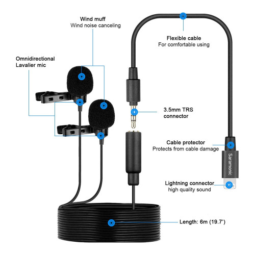 میکروفن یقه ای با سیم Saramonic LavMicro U۱C، برای ضبط صدا از دو منبع جداگانه در هنگام مصاحبه راه حلی ارزان قیمت را فراهم میکند. این محصول دو میکروفون یقهای دارد که صدای شفاف و صوت دقیق دیجیتالی را مستقیماً از طریق پورت لایتنینگ به گوشی آیفون و یا دستگاه ios ارسال میکند و برای ضبط پادکست، تولید ویدئو، مصاحبه و موارد دیگر گزینه ایدهآلی است.