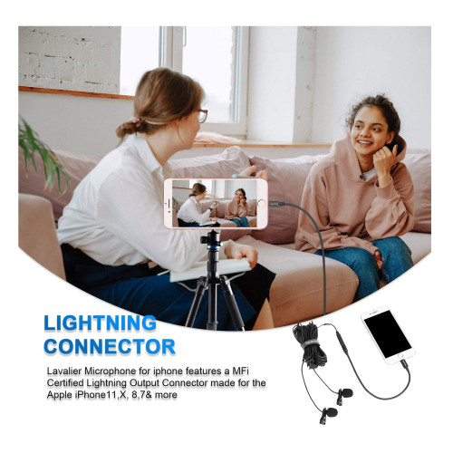 میکروفون یقهای LavMicro U1C یک کابل آداپتور لایتنینگ دارد که میتوانید آن را جدا کنید؛ در انتهای این کابل جک ۳.۵ میلیمتری نری تعبیه شده است. طول کابل این محصول با اتصال به آداپتور لایتنینگ حدود ۶ متر میشود، و برای اتصال میکروفونها به منابع صوتی (سوژههایتان) فاصله مناسبی را فراهم میکند. میکرووفنها، پاور مورد نیاز خود را از طریق دستگاههای ios شما دریافت میکنند و باتری داخلی ندارند. فوم بادگیر هم به منظور محافظت از نویز ایجاد شده همراه این محصول ارائه میشود.