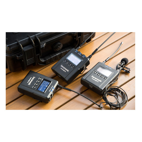 فرستنده این دستگاه را نیز میتوان بر روی لباس نصب کرد و میکروفون یقهای نیز به ورودی صدای آن متصل میشود و با یک فشار کوتاه دکمه روشن/خاموش میتوان میکروفون را قطع کرد. همچنین امکان تنظیم گین ورودی در 9 مرحله فراهم شده است. کاربر میتواند توان خروجی فرستنده را بسته به نیاز و فاصله بین فرستنده و گیرنده در سه حالت High/Med/Low تنظیم کند تا مصرف باتری را مدیریت کند.