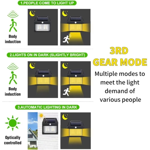 | حالتهای روشنایی | Mode 1 : عملکرد در شب و روشن شدن با حرکت اجسام در فاصله ۳ تا ۵ متری به مدت ۱۵ ثانیه./ Mode 2 :روشنایی با ۳۰ درصد توان نوری به صورت دائم در شب و حرکت اشیاء در ۵متری باعث روشن شدن تمام ظرفیت دستگاه به مدت ۳۰ ثانیه می شود./ Mode ۳ :روشن شدن با ۷۰ درصد ظرفیت خود و ثابت ماندن نور آن در شب (غیر فعال شدن سنسور حرکت) |