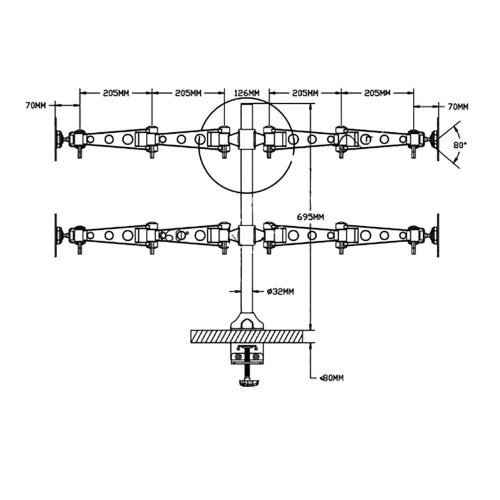 بدنه این پایه ترکیبی از آلومینیوم دایکست و آهن هست که مقاومت بالا و دوام طولانیمدتی داره. طراحی بدنه به گونهایه که هم سبک باشه و هم قدرت تحمل وزن بالا داشته باشه. پایه LD-6 توانایی نگهداری شش مانیتور به وزن هر کدوم تا ۱۰ کیلوگرم رو داره، یعنی در مجموع تا ۶۰ کیلوگرم رو ساپورت میکنه. فاصله از محل نصب و ارتفاع لوله هر دو ۷۰۰ میلیمتر هستن و حداکثر ارتفاع نصب مانیتورها از مرکز پایه تا ۸۴۲ میلیمتر قابل افزایشه. این یعنی انعطافپذیری خوبی برای چیدمان مانیتورها در دو ردیف (۳ بالا و ۳ پایین) یا هر شکل دلخواه دیگه فراهم میشه. به همراه پایه، راهنمای کامل نصب و تمامی ملزومات موردنیاز هم ارائه میشه.