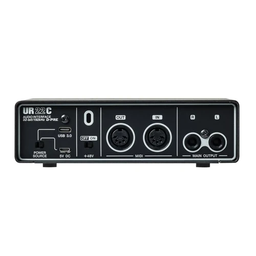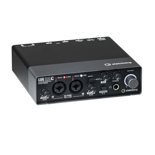 این کارت صدا از رابطهای XLR و TRS پشتیبانی میکنه و نسبت سیگنال به نویزش ۱۰۷ دسیبل برای خروجی لاین و ۱۰۴ دسیبل برای ورودی میکروفون هست. منبع تغذیه از طریق USB-3.0 Bus Power (۵V @ 900mA) یا آداپتور ۵V DC تامین میشه و دو ورودی آنالوگ XLR-1/4 و دو خروجی آنالوگ ۱/۴، همچنین ورودی و خروجی MIDI (۵-pin DIN) برای اتصال به کیبورد یا سایر ابزارهای موسیقی در دسترس هستن. کیفیت ضبط تا ۳۲ بیت/۱۹۲ کیلوهرتز هست و قابلیتهایی مثل فانتوم پاور ۴۸V، نشانگر LED، تنظیم گین و خروجی هدفون برای مانیتورینگ بدون تأخیر با Direct Monitor در اختیار کاربر قرار میگیرن. علاوه بر این، UR22C از نرمافزارهای Cubase AI و Cubasis LE و Steinberg Plus با VSTها و لوپهای رایگان پشتیبانی میکنه و با USB 3.0 و USB-C سازگار هست.