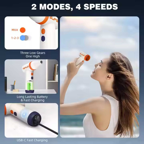 یکی از نقاط قوت این دستگاه، باتری 1100 میلیآمپر ساعتی اونه که قابلیت استفاده بین 0.4 تا 4.5 ساعت رو داره. این بازهی زمانی بستگی به میزان قدرتی داره که از فن استفاده میکنین. موتور قدرتمند این فن با توان 40 وات و سرعت چرخش 100000 دور در دقیقه (RPM) عملکردی فوقالعاده داره و میتونه جریان هوای بسیار خوبی رو ایجاد کنه. در کنار این ویژگیها، طراحی دقیق و مواد اولیه باکیفیت باعث شده که این فن یکی از بهترین گزینههای موجود در بازار باشه.