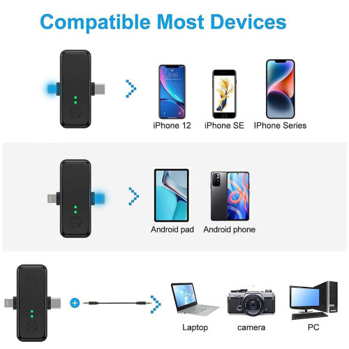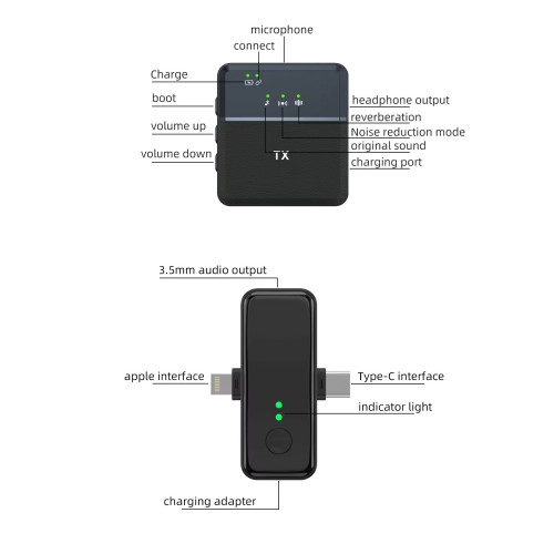 | اقلام همراه میکروفون | ۲ عدد فرستنده | ۱ عدد گیرنده | ۱ عدد کابل Type-C برای شارژ | 1 عدد تبدیل جک 3.5 میلی متری TRRS (3خط) به جک 3.5 میلی متری TRS (2خط) |