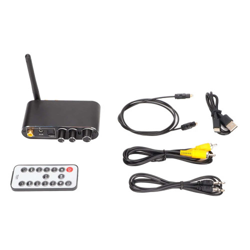 | سایر مشخصات فرستنده گیرنده | دارای کلید روشن و خاموش کردن | مناسب برای دستگاه های فاقد بلوتوث و فلش مانند سیستم های صوتی خانگی و ... | مبدل درگاه Optical به RCA و AUX | نرخ نمونه برداری تا 192KHz | پشتیبانی از صدای دیجیتال 5.1 و 7.1 کانال و ... | بدون افت صدا | دارای تنظیم Bass , Treble و حجم صدا با قابلیت تقویت کنندگی (این محصول آمپلی فایر نیز میباشد) | قابلیت کاهش هوشمند نویز | دارای آنتن | قابلیت عوض کردن موسیقی | دفترچه راهنما | 1 عدد کابل Type-C | 1 عدد ریموت کنترل | 1 عدد کابل AUX | 1 عدد کابل جک 3.5 میلی متری به RCA | 1 عدد کابل COAXIAL | 1 عدد کابل OPTICAL |