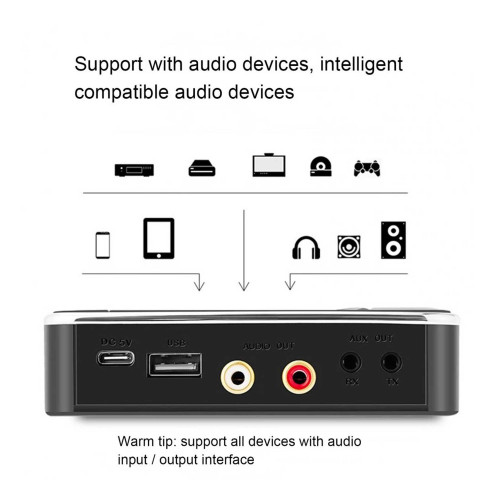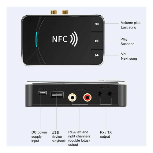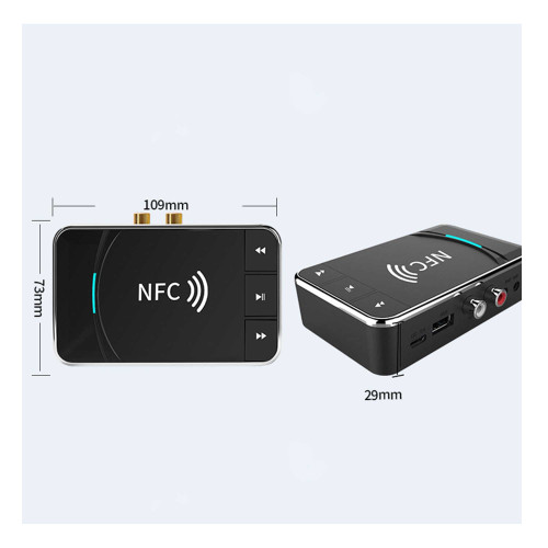 این محصول با کاربری فرستنده و گیرنده و با رابط های بلوتوث ورژن 5، جک 3.5 میلیمتری، جک RCA امکانات مختلفی از ارسال تا دریافت صوتی فراگیر رو برای شما فراهم میکنه. این محصول دارای محدوده عملکرد 15 متر بدون مانع و فرکانس پاسخگویی 10 تا 20000 هرتز هست که نسبت سیگنال به نویزی 110 دسیبلی داره و از پروفایلهای AVRCP / A2DP پشتیبانی میکنه. این محصول همچنین دارای تکنولوژی NFC هم هست.