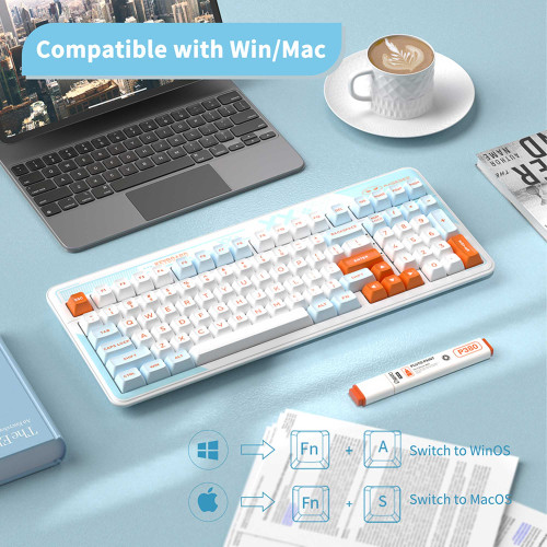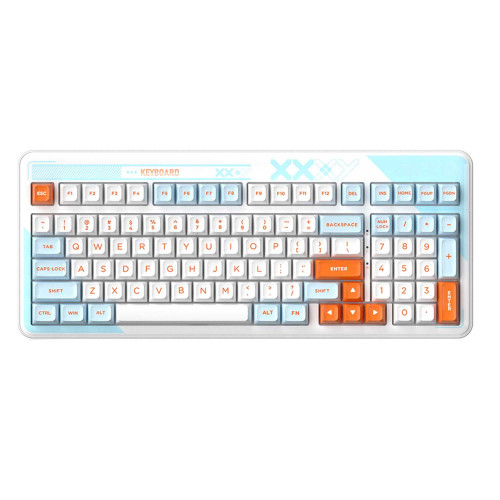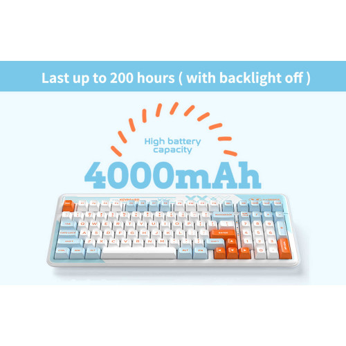 کیبورد KW99 از طریق سه روش اتصال قابل استفادهست: دانگل USB، کابل Type-C و بلوتوث. این کیبورد ۱۰۴ کلید کاربردی داره که شامل کلیدهای مدیا هم میشه. نور پسزمینه آبی و نشانگر LED، ظاهری جذاب به کیبورد میده و استفاده در محیطهای کمنور رو راحتتر میکنه.