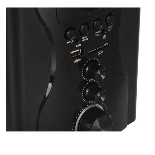 همونطور که توی تصویر هم میبینین، TS-2198 با کلیدهای مکانیکی که داره، خیلی راحت قابل تنظیمه. این کلیدها بهصورت اهرمهای چرخشی، جلوی ووفر قرار گرفتن. قسمت بالای اون هم درگاههایی برای اتصال usb، کارت حافظه و همچنین رابطها تعبیه شدن.