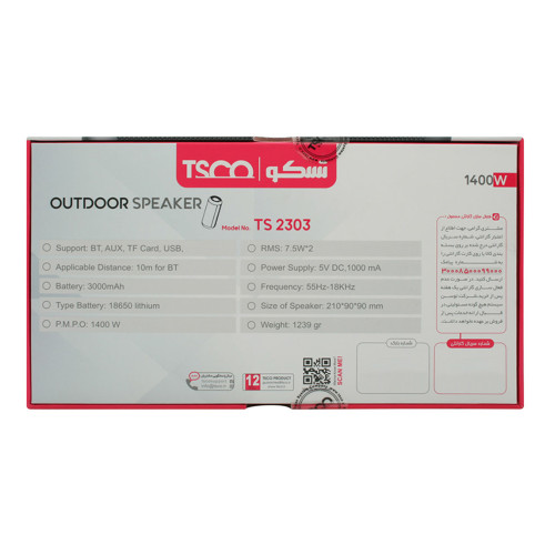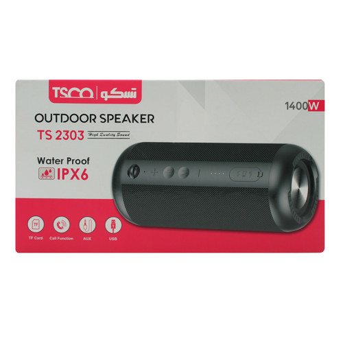 اسپیکر قابل حمل بلوتوثی مدل TS 2303 محصولی از شرکت بزرگ تسکو است. اسپیکر تسکو با طراحی استوانه ای شکل، داری بدنه مستحکمی از جنس پلاستیک با دوام از نوع ABS است. این اسپیکر در برابر گرد و غبار و همچنین در برابر آب مقاوم هست و شما میتوانید با خیال راحت از این اسپیکر در استخر یا لب ساحل هم استفاده کنید . بر روی اسپیکر تسکو مدل TS 2398 کلید هایی تعبیه شده است تا امکان مدیریت خاموش و روشن کردن ، کم یا زیاد کردن صدا ، پخش یا توقف و یا رد کردن موسیقی را به شما بدهد. این اسپیکر در ابعاد 90*90*210 میلی متر و با وزن 1239 گرم دارای صدای بسیار زیبایی است و از آنجایی که آن را به صورت استوانه ای طراحی کرده اند، دارای صدایی 360 درجه است. این محصول با دو باند با توان واقعی 15 وات و فرکانسی در رنج بین 55 هرتز تا 1800 هرتز میتواند برای شما صدایی بلند و لذت بخش را پخش کند. اسپیکر TS 2303 دارای ورودی AUX، درگاه کارت حافظه است و همچنین از بلوتوث نسخه 5 با برد 10 متر هم پشتیبانی می کند. شما میتوانید اسپیکر خود را به لپ تاپ یا کامپیوترهای خانگی و یا تمامی گوشی های هوشمند ( اندروید و آیفون ) از طریق کابل AUX یا از طریق بلوتوث متصل کنید و از صدای زیبای این اسپیکر لذت ببرید. این اسپیکر دارای میکروفن داخلی است و برای شما این امکان را فراهم میکند که در هنگام تماس های تلفنی دیگر نیازی به قطع کردن اتصال گوشی به اسپیکر را نداشته باشد و به راحتی با اسپیکر میتوانید به مکالمه خود بپردازید. اسپیکر تسکو مدل TS 2303 مجهز به باتری 3000 میلی آمپری است. شما می توانید باتری لیتیوم یونی که در این محصول به کار رفته است را با استفاده از کابل شارژ Micro USB تعبیه شده در آن شارژ کنید. این اسپیکر در حالت استندبای 74 ساعت شارژ باتری را در خودش ذخیره میکند.