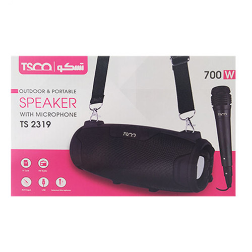 اسپیکر بلوتوثی مدل TS 2319 محصولی زیبا از شرکت بزرگ Tsco است. این اسپیکر دارای دو باند قدرتمند با توان 10 وات است که صدایی بسیار رسا و با کیفیتی را برای شما ایجاد میکند. محدوده فرکانسی این محصول بین ۱۰۰ هرتز تا ۱۸ کیلوهرتز است و حساسیت سیگنال به نویز آن ۸۰ دسی بل است. همچنین این اسپیکر مجهز به میکروفون داخلی نیز است. این میکروفون امکان برقراری تماس های تلفنی را برای شما فراهم میکند. این اسپیکر زیبا طوری طراحی شده است که حمل نقل آن بسیار آسان باشد، همچنین برای آن یک بند نیز تعبیه شده است که با استفاده از آن شما میتوانید به راحتی بند اسپیکر را روی شانه خود بندازید و به راحتی آن را جابهجا کنید. اسپیکر میکروفن دار تسکو مدل TS2319 از طریق بلوتوث نسخه 5.0 به گوشی موبایل، تبلت، لپ تاپ و سایر دستگاه های هوشمند متصل میشود. بلوتوث این دستگاه تا شعاع ۱۰ متری ارتباطی پایدار را برقرار نگه می دارد. این محصول دارای پورت USB جهت اتصال فلش مموری ، درگاه حافظه رم برای قراردادن کارت حافظه میکرو SD و همچنین دارای رابط جک صوتی ۳٫۵ میلی متری (AUX) برای اتصال باسیم به دستگاه نیز است. جنسه بدنه اسپیکر بلوتوثی تسکو از پلاستیک مقاوم ( ABS ) است و بر روی آن دکمه هایی به منظور مدیریت پخش آهنگ، تنظیم میزان ولوم و … قرار گرفته است. از دیگر ویژگی های این پخش کننده میتوان به درگاه ورودی میکروفون آن اشاره کرد. با متصل کردن میکروفونی که همراه اسپیکر هست، شما میتوانید علاوه بر ضبط صدا، از قابلیت کارائوکه آن نیز جهت سرگرمی از طریق همخوانی با موسیقی در حال پخش، تمرین خوانندگی و … استفاده کنید. این اسپیکر از رادیو FM نیز پشتیبانی می کند که با دریافت باکیفیت سیگنال کانال ها، برنامه های رادیویی را با صدایی عالی و شفاف پخش می کند. این دستگاه انرژی مورد نیاز خود را از باتری لیتیوم یونی با ظرفیت ۱۲۰۰ میلی آمپر تامین میکند. در صورت تکمیل بودن شارژ باتری شما میتوانید به مدت 5 ساعت با این اسپیکر موزیک گوش بدهید و میتوانید از طریق پورت میکرو USB تعبیه شده در پشت سیستم در زمان حداکثر 3.5 ساعت، برای شارژ مجدد آن استفاده کنید.