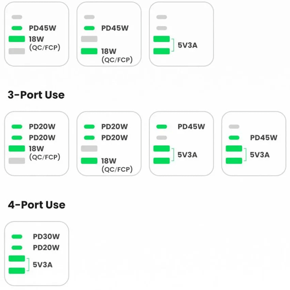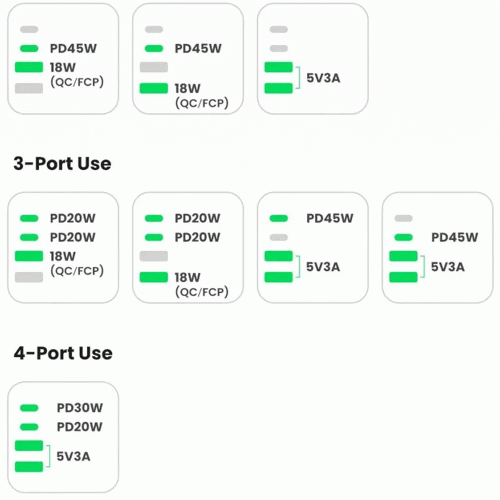 | خروجی تایپ سی 1 و 2 | C1/C2: 5 V/3 A, 9 V/3 A, 12V/3 A, 15V/3 A, 20 V/3.25 A, 3.3–21V/3 A, 65 W Max. |