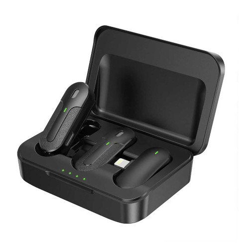 توی بستهبندی این محصول دو فرستنده 5 گرمی با سایز 46×17×16 میلیمتر و یه گیرنده 9 گرمی با سایز 10×26×41 میلیمتر همراه با کیسی قرار گرفته که هم اونها رو داخل خودش نگه میداره و هم شارژشون میکنه. فرستنده این میکروفون در نزدیکی منبع تولید صدا تعبیه شده و گیرنده هم به گوشی یا دستگاه دیجیتال مورد نظر شما وصل میشه. بعد از ایجاد ارتباط بلوتوثی میتونین از این میکروفون استفاده کنین.