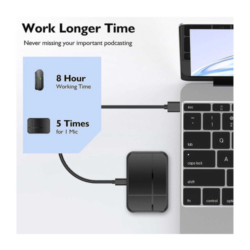 میکروفون M8 دو میکروفون، یه باتری داخل هرکدوم از فرستندهها و یه باتری داخل کیس داره. این باتریها از نوع لیتیوم یون در نظر گرفته شدن و توی فرستنده ظرفیت 70 و توی باکس شارژ ظرفیت 450 میلیآمپر ساعت دارن. زمانی که کیس و میکروفون رو به شارژ بزنین، بعد از دو ساعت پر میشن و میتونین از فرستنده برای 5 ساعت استفاده کنین.