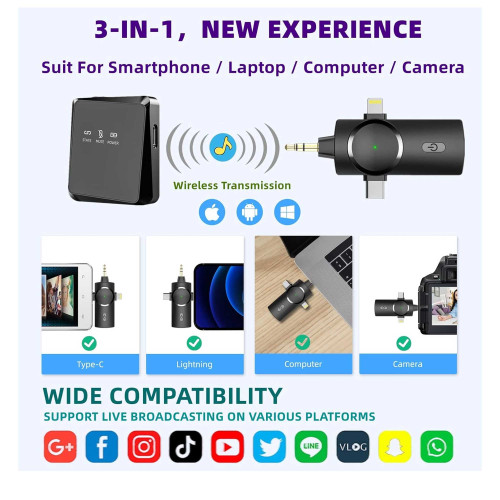 گیرنده میکروفون بی سیم مدل AP004 سه رابط مختلف داره که یکی از نوع aux، یکی تایپ سی و اون یکی لایتنینگه؛ بنابراین میتونه به هر دستگاهی وصل بشه. یه درگاه تایپ سی هم روی این گیرنده تعبیه شده که یه طرف اون قرار گرفته؛ بنابراین حتی موقع وصل بودنش به گوشی، تبلت و...، باز هم میتونین باتری گوشی مورد نظرتون رو شارژ کنین.