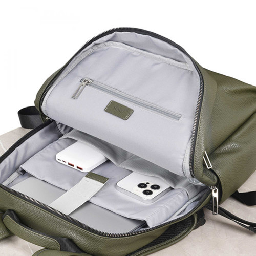 ابعاد این مدل 6×21×26.5 سانتیمتر هست که با وجود این اندازه جمعوجور، فضای داخلی خوبی برای قرار دادن وسایل فراهم کرده. جنس بهکار رفته در این کوله ترکیبی از چرم پلیاستر و PU با کیفیت بالاست که نهتنها ظاهر شیکی داره، بلکه در برابر نفوذ آب هم مقاومه و خیالتون رو از بابت محافظت از وسایلتون راحت میکنه.