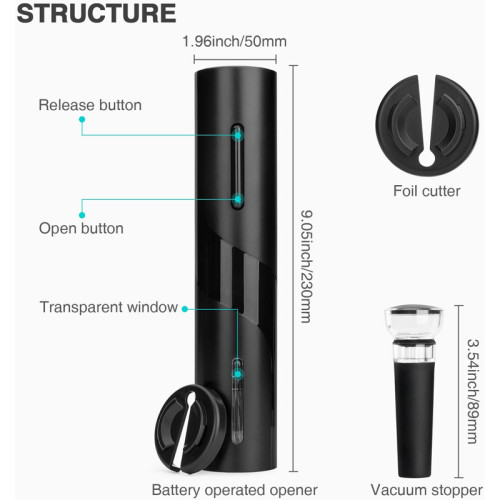 اجزا | چوب پنبه بازکن برقی، درپوش خلاء، چاقو فویل، نازل نوشیدنی الکتریکی |