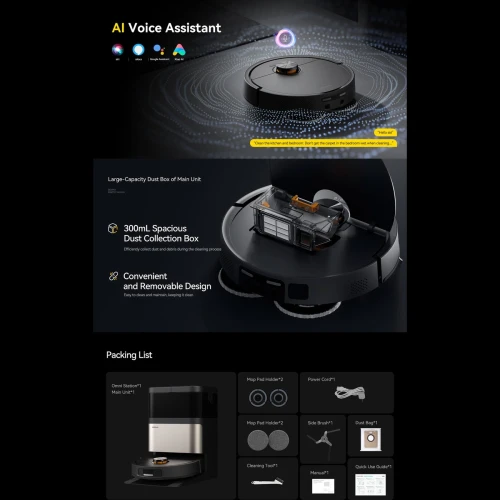 - محتویات جعبه : ربات، ایستگاه Omni، کابل برق، 2 عدد پد تی، 2 عدد برس کناری، کیسه زباله، برس تمیزکننده، دفترچه راهنما
