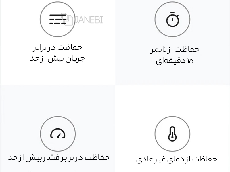 مکانیسم های حفاظتی چندگانه | حفاظت در برابر جریان بیش از حد/محافظت در برابر فشار بیش از حد/حفاظت زمانبندی 15 دقیقه/محافظت در برابر ناهنجاری دما |