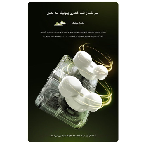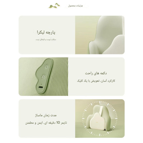 | سایر ویژگی ها | استانداردهای پیاده سازی GB4706.1-2005 GB4706.10-2008، پارچه لاکرا سازگار با پوست، دکمه های سیلیکونی، تایمر خودکار 10 دقیقه ای، دارای یک حامی کوچک روپل، کنترل عملکرد 3 حالته، ماساژور طب فشاری بیونیک 3D، طراحی باریک و ارگونومیک به صورت قابل جدا شدن، کمپرس گرم گردان، ریل عمودی جهت جابجایی محل سری های ماساژ، ماساژ در نقطه ثابت |