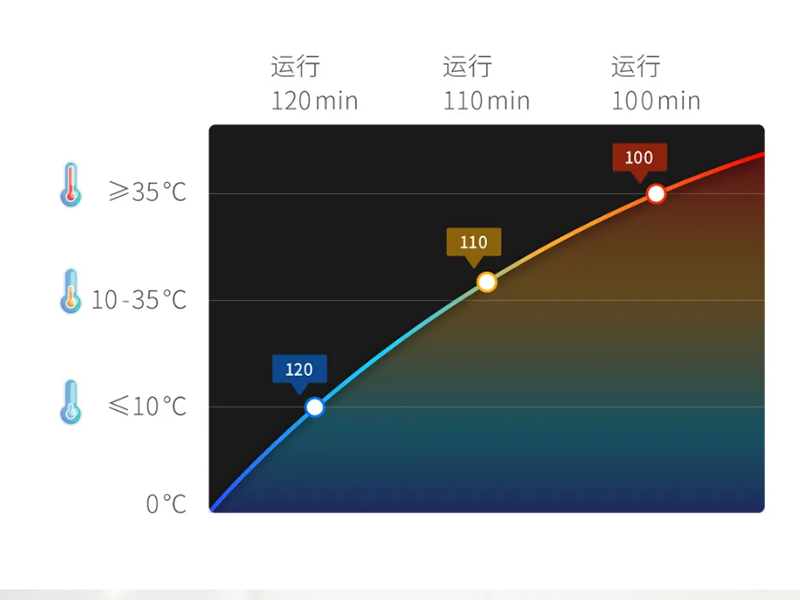 زمان کار دستگاه بر اساس دمای محیط | 35 درجه سانتیگراد حدود 100 دقیقه، دمای 10-35 درجه سانتیگراد 110 دقیقه و دمای زیر 10 درجه سانتیگراد 120 دقیقه |