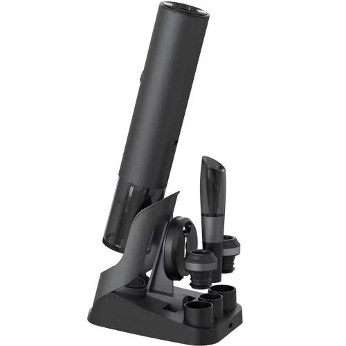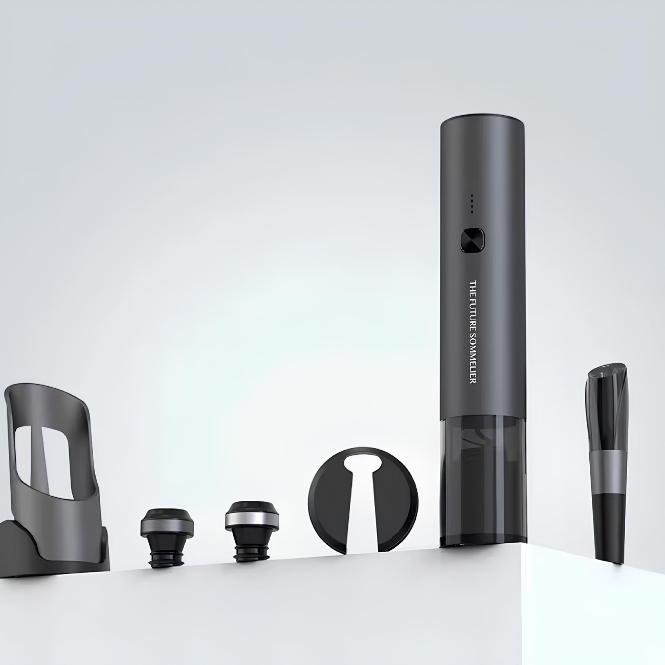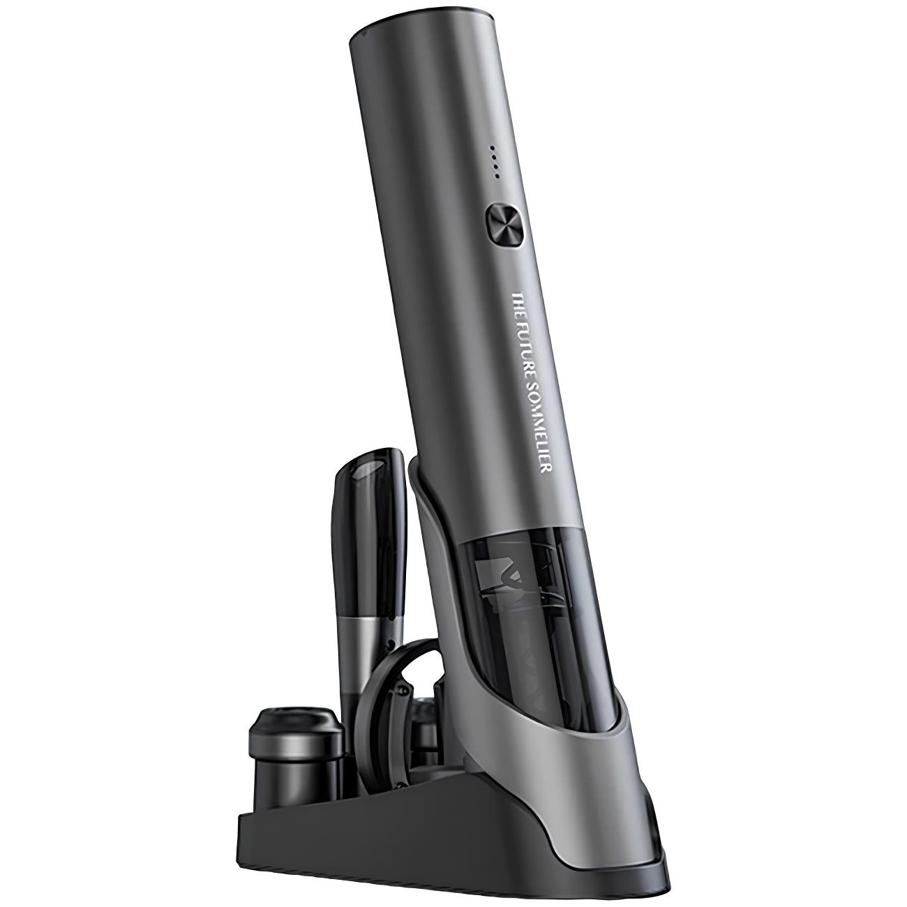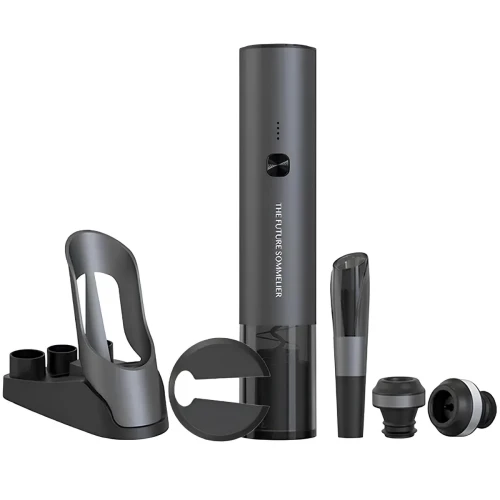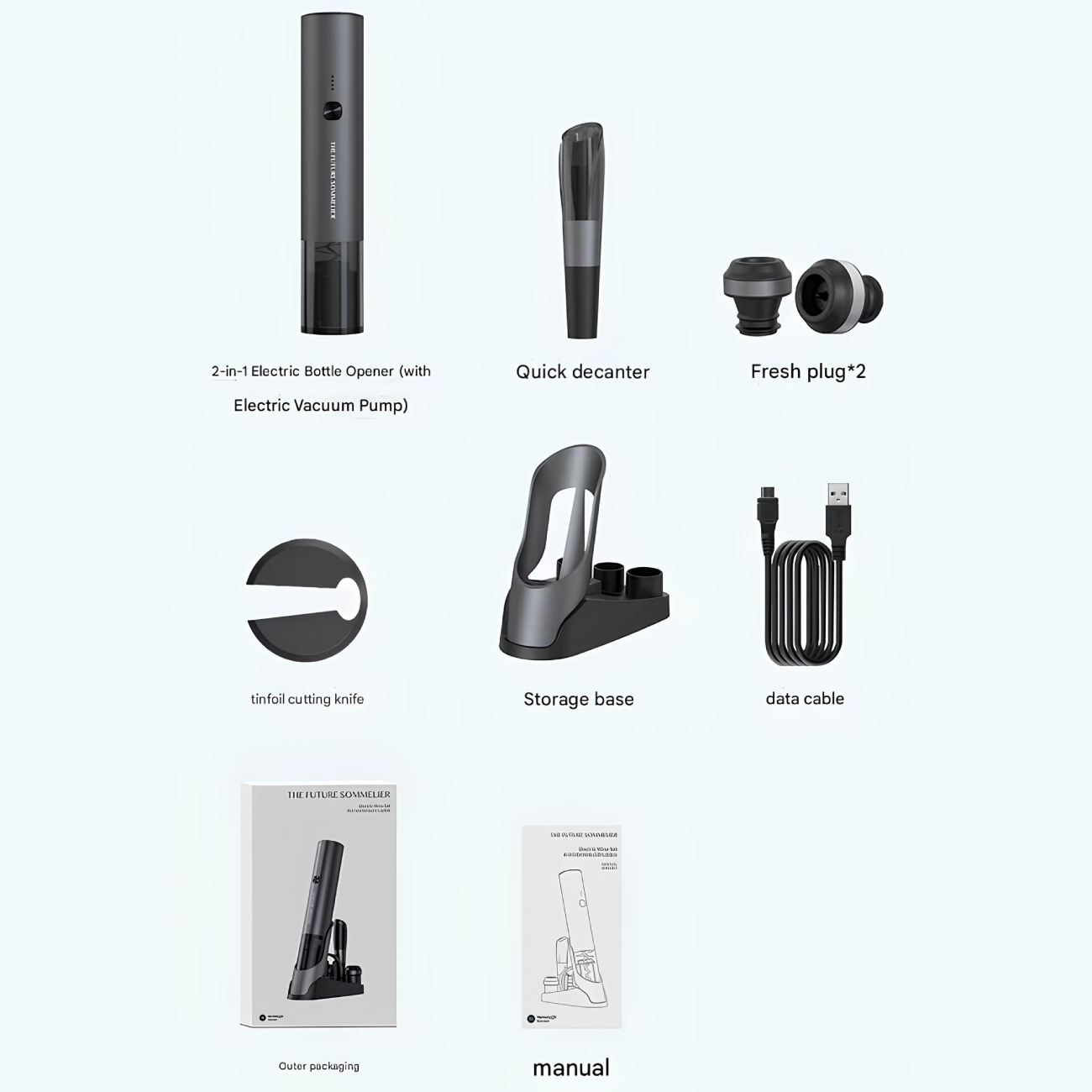 محتوای بسته | درب بطری بازکن شارژی، چاقوی برش فویل، 2 درپوش نگهدارنده، ظرف هوادهی، پایه شارژ، کابل شارژ Type-C و دفترچه راهنمای محصول |