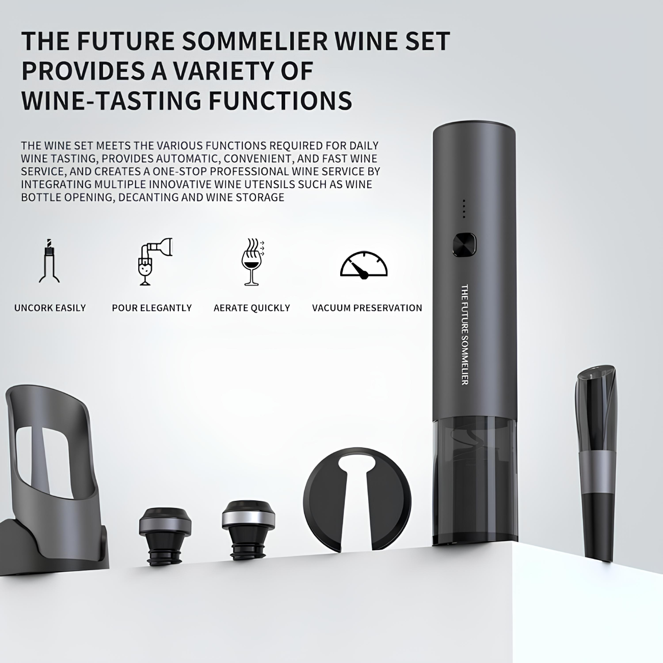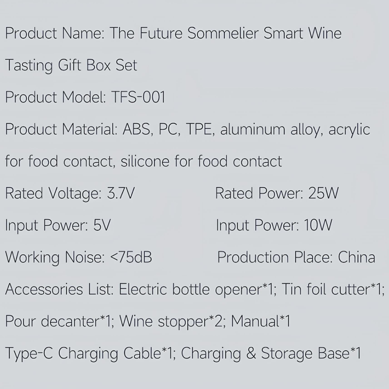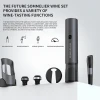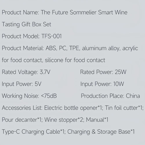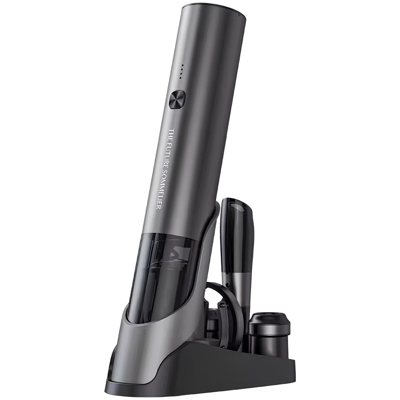 محتوای بسته | درب بطری بازکن شارژی، چاقوی برش فویل، 2 درپوش نگهدارنده، ظرف هوادهی، پایه شارژ، کابل شارژ Type-C و دفترچه راهنمای محصول |