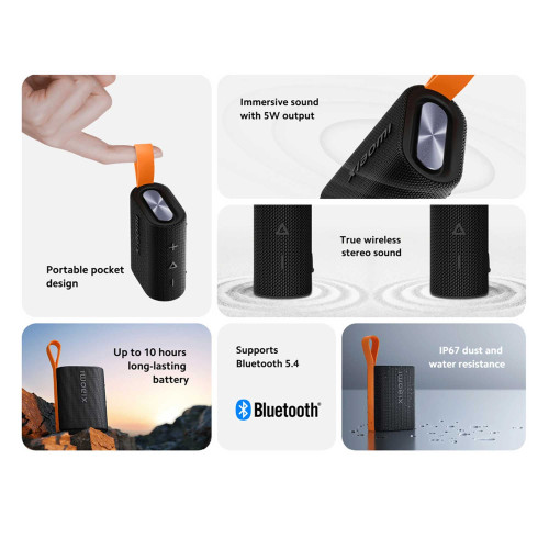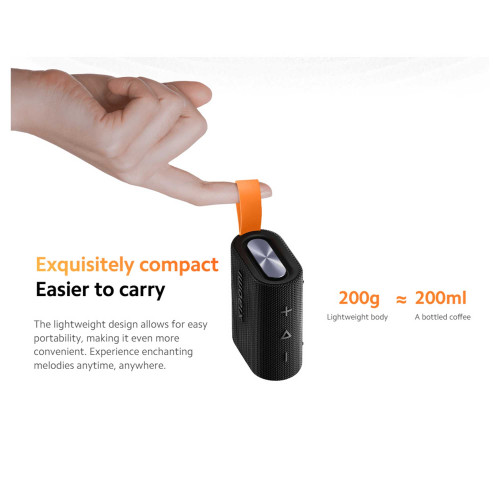 این اسپیکر پرتابل تنها 200 گرم وزن داره و ابعادش برابر با 90.8 در 74.4 در 42.6 میلیمتره، یعنی بهراحتی داخل کیف یا حتی جیب جا میشه. بدنه از پلاستیک مقاوم با طراحی مات و مشبک ساخته شده که هم ظاهر شیک و مدرنی بهش داده و هم باعث شده در برابر ضربههای سبک مقاوم باشه. اسپیکر یه واحد داخلی به همراه یه ووفر داره که میتونه صدای واضحی رو پخش کنه. دکمههای فیزیکی چندکاره روی بدنه قرار دارن و کارهایی مثل تنظیم صدا، پخش یا توقف موسیقی و پاسخ به تماسها رو ساده میکنن.
