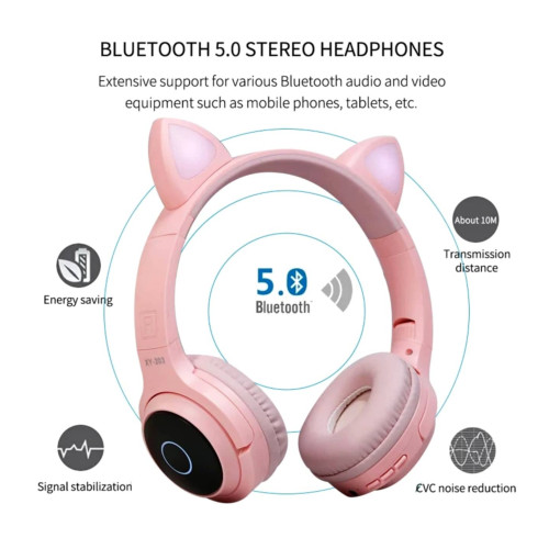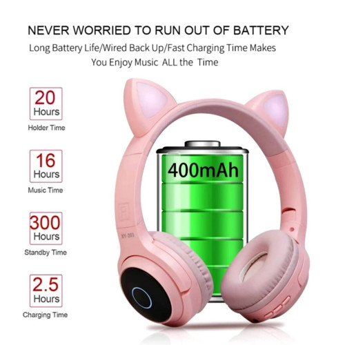 هدفونهای بچگانه یا ویژه کودکان دارای یک وظیفه بسیار مهم و اساسی هستند که از شنوایی کودکان محافظت نمایند، حال با توجه به این موضوع بسیار مهم که ممکن است استفاده ازهدفونهای بیکیفیت و بدوننام و غیر اصل کودکان را در معرض خطر قراردهد، باید پدرها و مادران جهت انتخاب هدفون برای فرزندان خود به توصیههای مراجع جهانی توجه نمایند. استفاده از هدفون برای کودکان نباید با صدای بیشتر از 85 دسی بل و هر بار بیش از 60 دقیقه باشد و همچنین ایدهآلترین سن استفاده از هدفون با سیم برای کودکان در سنین سه سالگی الی نه سالگی است. هدفون بیسیم ویژه کودکان، طرح گربه مدل XY-203 یک هدفون مخصوص از نوع over Ear یا رو گوش است و بدون آسیب به گوش و مغز کودکان از طریق بلوتوث، امکان گوش دادن به موسیقی و مکالمه را فراهم میآورد. طراحی خاص این هدفون کودکانه با گوشیهای چرمی و هدست تاشو به گونهایست که آن را از دیگر هدفونها متمایز ساخته است. پدهای ازجنس فوم گوشیها به گونهای است که هر سر و صدایی از دنیای بیرون را فیلتر کرده و میتوانید غرق در موسیقی شوید، این هدفون فانتزی بسیار نرم است و نمیشکند طراحی ارگونومیک پدهای هدفون به کاربران این امکان را میدهد تا مدت زمان طولانی و بدون خستگی گوش به راحتی با هدفون کار کنند. بر روی بدنه این هدفون دو گوش به شکل گوش گربه به کار رفته است که 3 حالت رقص نور دارند و همچنین بر روی پد بیرونی نیز چراغهای LED به کار رفته است که رقص نور دارند. بر روی پدهای گوشی علاوه بر کلیدهای کنترل موسیقی و خاموش و روشن کردن و کلید برقراری مکالمه، ورودی کابل USB جهت شارژ هدفون تعبیه شده است. با بلوتوث با نسخه 5، این هدفون امکان برقراری اتصال بیسیم با تمامی دستگاههای دارای قابلیت بلوتوث را با بُرد 10 متر فراهم میسازد و همچنین اگر به بلوتوث دسترسی نداشتید می توانید از طریق کابل صدا و خروجی AUX استفاده کنید. درایورهای داخلی این هدفون به قطر 40 میلیمتر صدایی واقعی، استریو و بدون هیچ نویزی برای شما به ارمغان میآورد. در داخل آن یک میکروفون وجود دارد که امکان پاسخگویی به تماس را برای فرزند شما فراهم می سازد. میزان صدای این هدفون بچگانه قابلیت تنظیم بین 3 مقدار 75، 85 و 94 دسی بل را دارد که استاندارد جهانی برای استفاده کودکان و نوجوانان از هدفون است و هرچه سن فرزند شما کمتر باشد باید میزان دسی بل صدا را کاهش دهید. باتری 500 میلیآمپری این هدفون با 3 ساعت شارژ از طریق درگاه Type-C ، بیشتر از 45 ساعت پخش موسیقی و کار مداوم را برای شما به ارمغان می آورد.