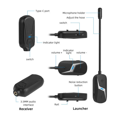 | اقلام همراه میکروفون | دفترچه راهنما | ۱ عدد گیرنده | ۱ عدد فیلتر نرم کننده صدا | تبدیل جک ۳.۵ میلی متری به جک ۶.۳۵ میلی متری | ۱ عدد تبدیل 2به1 جک 3.5 میلی متری برای اتصال به گوشی های هوشمند | 1 عدد کابل Type-C به Type-C | 1 عدد کابل USB-A به Type-C | گیره نگهدارنده میکروفون | کابل AUX |