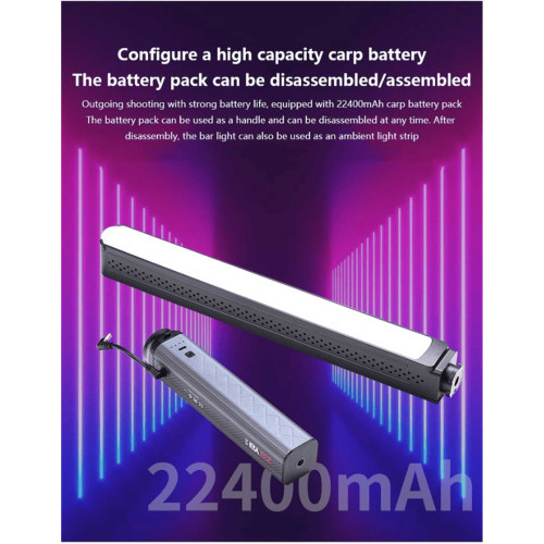 این محصول با ابعاد 650 در 160 میلیمتر و ضخامت 160 میلیمتر طراحی شده. وزن دستگاه حدود 1500 گرم هست که با توجه به ابعاد و ظرفیت بالای باتری داخلی، وزن مناسبی محسوب میشه. طراحی باتومی و کشیده این مدل باعث میشه نور به صورت یکنواخت در محیط پخش بشه و برای ایجاد افکتهای خاص نوری بسیار کاربردی باشه. بدنه مقاوم دستگاه هم به گونهای ساخته شده که تحمل استفاده طولانیمدت رو داشته باشه.